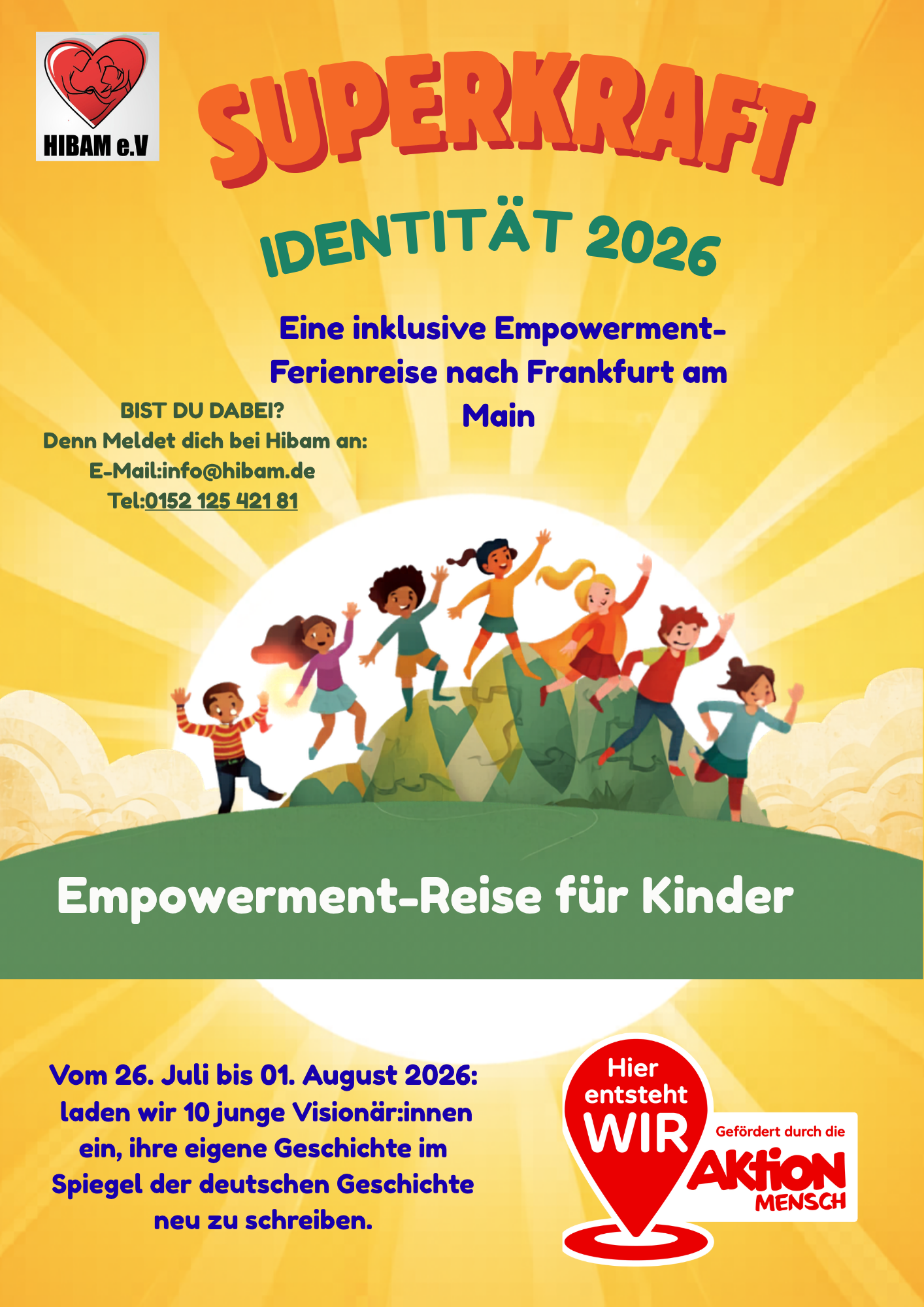 „SUPERKRAFT IDENTITÄT 2026“ Eine inklusive Empowerment-Reise von Hibam e.V. nach Frankfurt am Main. DEINE HERKUNFT IST KEIN HINDERNIS– SIE IST DEIN VORSPRUNG! Bist du es leid, immer nur über „Integration“ zu sprechen? Wir auch. Bei Hibam e.V. drehen wir den Spieß um. Wir gehen dorthin, wo Deutschland zeigt, wie modern, vielfältig und chancenreich es ist: nach Frankfurt am Main. Vom 26. Juli bis 01. August 2026 laden wir 10 junge Visionär:innen ein, ihre eigene Geschichte im Spiegel der deutschen Geschichte neu zu schreiben